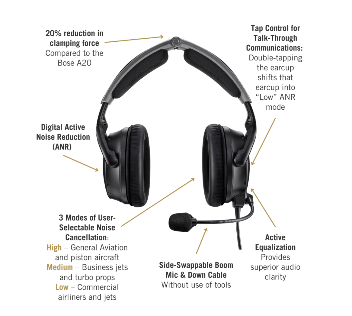 - Bose A30: Bose’s newest digital ANR system lets pilots switch between three noise cancellation modes, ideal for customizing based on aircraft type or personal preference.